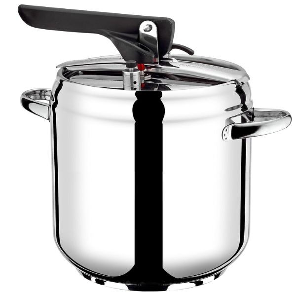 Greitpuodis POWER (9 l) – talpus ir profesionaliam naudojimui sukurtas 18/10 nerūdijančio plieno indas, tinkantis tiek HoReCa sektoriui, tiek didesnių porcijų gaminimui namuose. Aukštos kokybės plienas užtikrina ilgaamžiškumą ir atsparumą, o bajonetinė uždarymo sistema garantuoja saugų ir sandarų dangčio fiksavimą net esant aukštam slėgiui. Ergonomiškos juodo bakelito rankenos su geltonais akcentais apsaugo nuo įkaitimo ir suteikia patogų suėmimą.