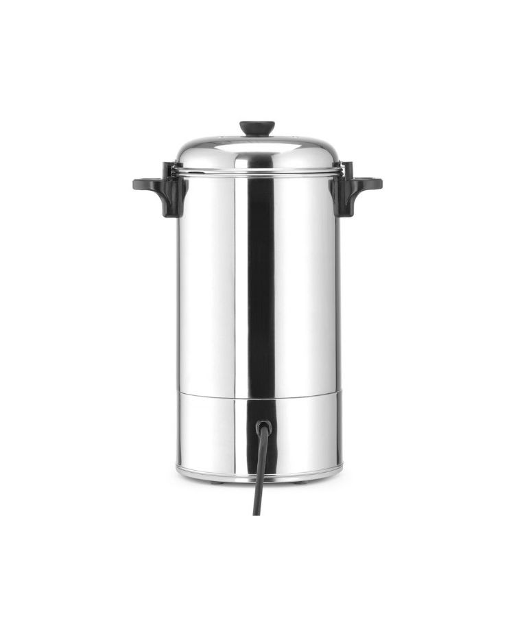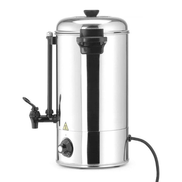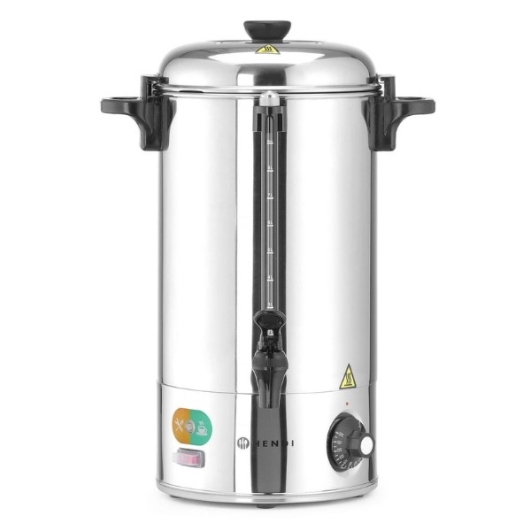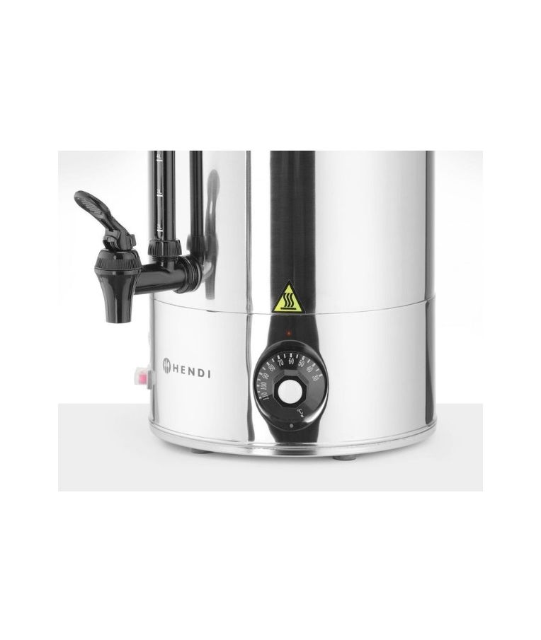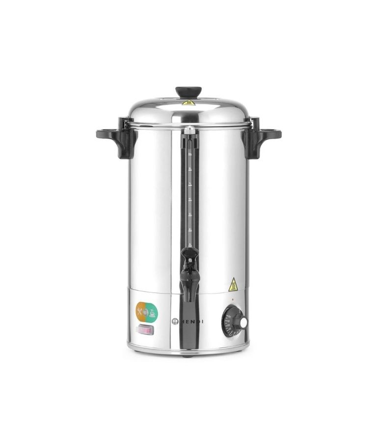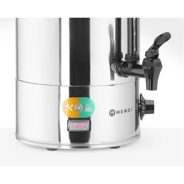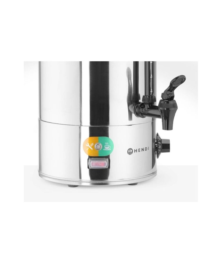 HENDI karštų gėrimų dispenseris 9 l – patikimas sprendimas profesionaliam arbatos, karšto vyno ir kitų karštų gėrimų ruošimui bei palaikymui šiltai. Įrenginys pasižymi 2200 W galia, leidžiančia greitai užvirinti vandenį – apie 9 litrus per maždaug 23 minutes. Nerūdijančio plieno rezervuaras su viensluoksnėmis sienelėmis užtikrina patvarumą, higieną ir lengvą valymą. Integruota apsauga nuo įjungimo be vandens padidina saugumą eksploatacijos metu. Dispenseris puikiai tinka naudoti kavinėse, bufetuose, renginiuose ar kitose HORECA sektoriaus vietose.