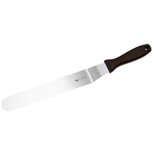 Lenkta mentelė 30 cm – profesionalus virtuvės įrankis, skirtas patogiam ir tiksliam maisto apvertimui, kepimui bei serviravimui. Dėl ilgesnio ilgio ir kampuotos formos mentelė leidžia lengvai dirbti su didesniais patiekalais bei pasiekti sunkiau prieinamas vietas keptuvėje ar kepimo induose.