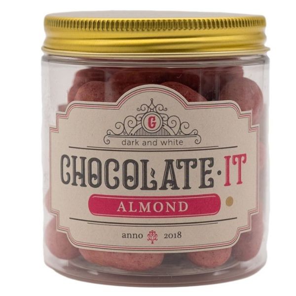 Karamelizuoti migdolai baltame šokolade su vaflių traškučiais ir aviečių rūgštele. Gurmaniškas saldumo ir gaivumo derinys desertams ar dovanai.