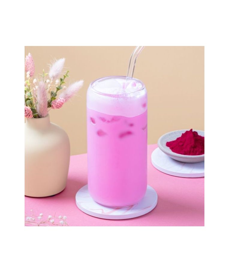 PINK LATTE milteliai 350 g – švelnaus raudonųjų vaisių skonio gėrimo mišinys su burokėlių milteliais, suteikiančiais natūralų rožinį atspalvį. Veganiškas produktas be dirbtinių dažiklių ir kvapiųjų medžiagų, pagamintas Prancūzijoje. Lengvai paruošiamas – tereikia 2 arbatinių šaukštelių (10 g) į 200 ml pieno ar augalinio gėrimo. Puikiai tinka karštas arba šaltas vasaros sezonui, galima papildyti sirupu, kad sukurtumėte išskirtinį skonį.