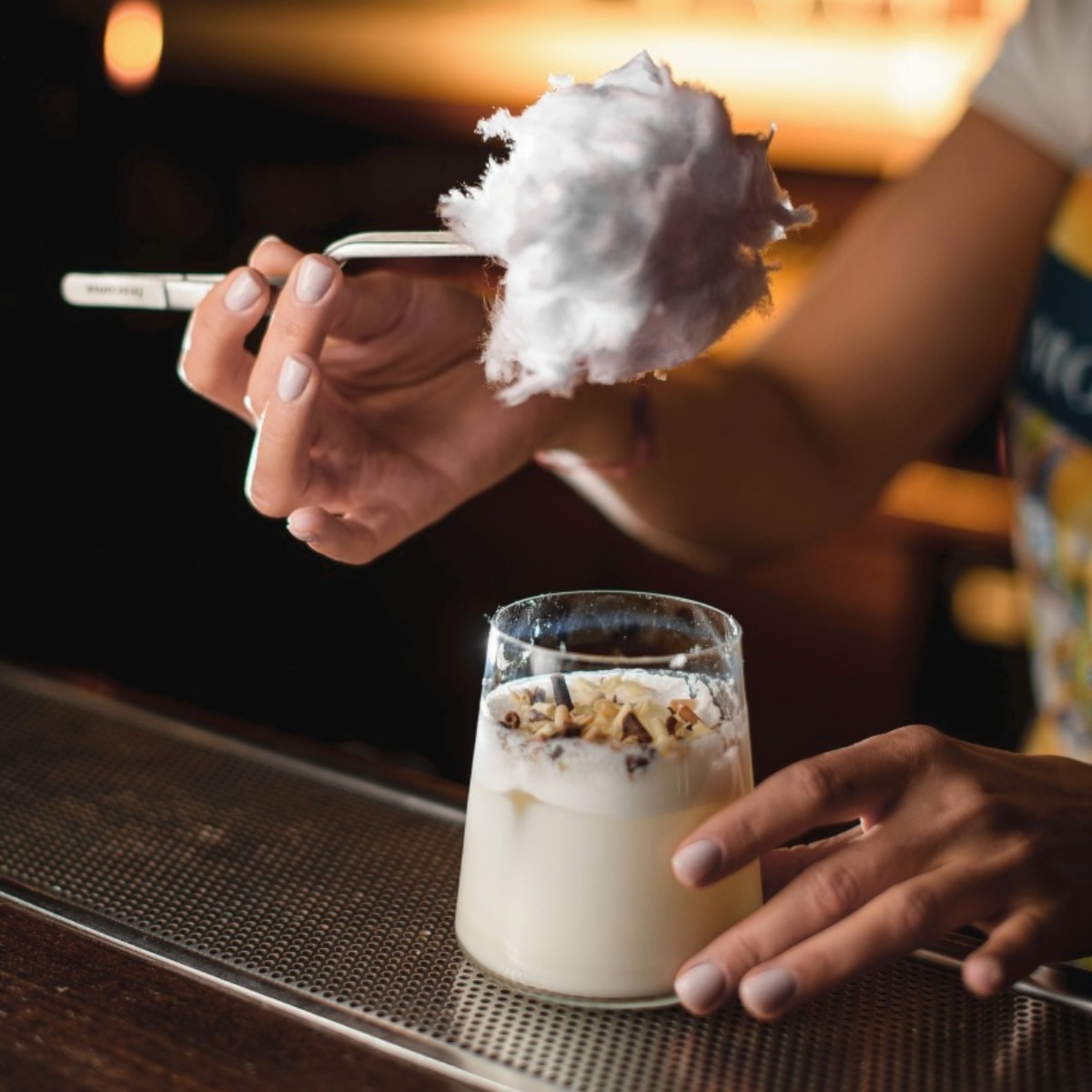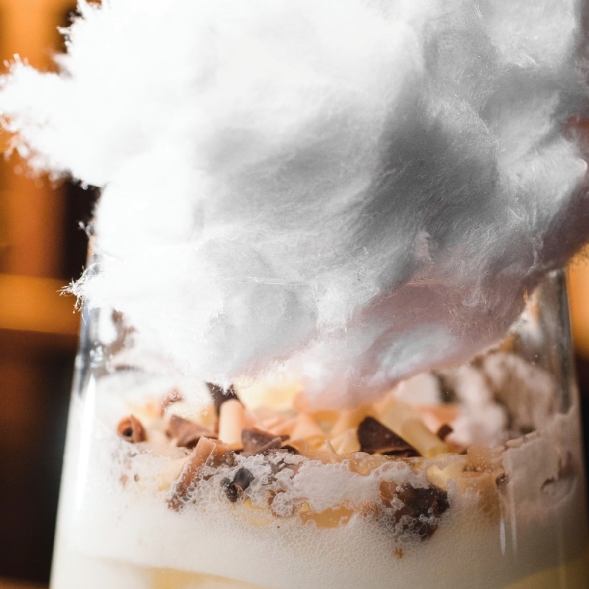 Į plaktuvą supilti MONIN Cukraus vatos sirupą, MONIN Vanilės sirupą ir pieną. Gerai suplakti, perpilti į stiklinę su ledu ir papuošti plakta grietinėle bei spalvotais pabarstukais.