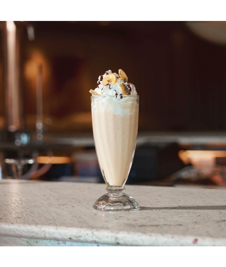 Į plaktuvą supilti MONIN Geltonų bananų sirupą, MONIN Šokolado sirupą ir pieną. Gerai suplakti, perpilti į stiklinę su ledu ir papuošti plakta grietinėle bei šokolado drožlėmis.