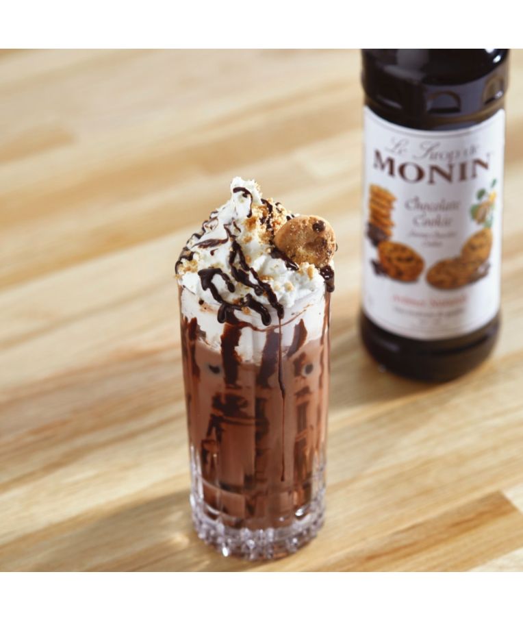 Į plaktuvą supilti MONIN Šokoladinių sausainių sirupą, MONIN Vanilės sirupą ir pieną. Gerai suplakti, perpilti į stiklinę su ledu ir papuošti plakta grietinėle bei šokolado drožlėmis.