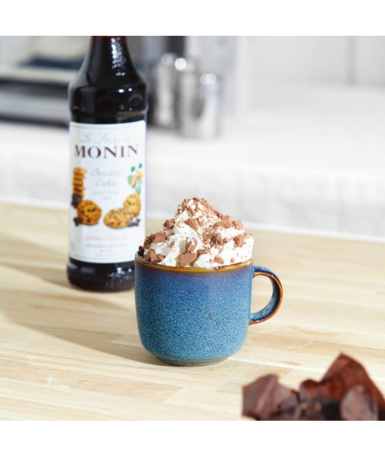 Į plaktuvą supilti MONIN Šokoladinių sausainių sirupą, MONIN Vanilės sirupą ir pieną. Gerai suplakti, perpilti į stiklinę su ledu ir papuošti plakta grietinėle bei šokolado drožlėmis.
