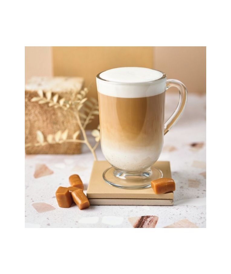 Pakaitinkite pieną ir įpilkite MONIN sūrios karamelės sirupo. Ant viršaus švelniai užpilkite espreso. Papuoškite norimu piešimu naudojant MONIN l'Artiste padažus.