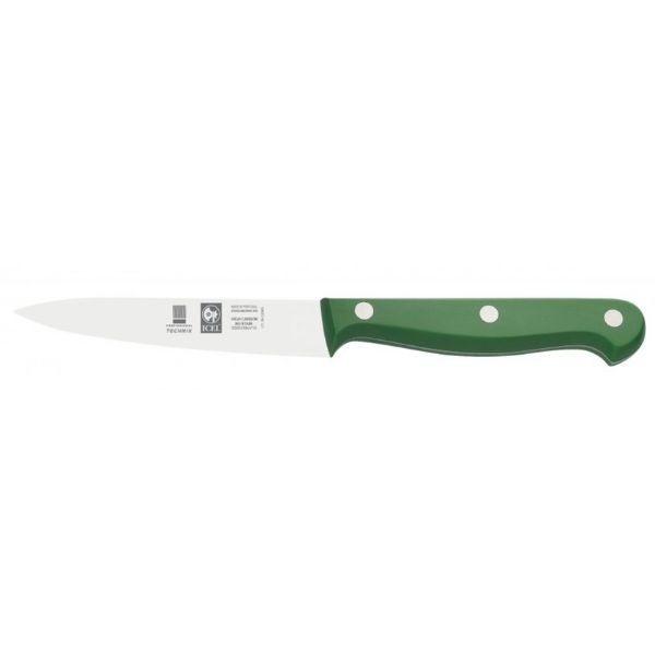 Daržovių peilis ICEL Technik serijos, 10 cm, žalias – profesionalus paring tipo peilis, skirtas vaisių ir daržovių lupimui, pjaustymui bei dekoravimui. Smaili geležtė leidžia atlikti tikslius ir preciziškus darbus, o vientisa (full tang) konstrukcija užtikrina puikų balansą, stabilumą ir komfortą naudojimo metu. Ergonomiška rankena suteikia patikimą sukibimą net dirbant drėgnomis rankomis ir padeda sumažinti nuovargį ilgesnio darbo metu. Technik serija pasižymi tradiciniu, aukšto našumo dizainu ir yra pritaikyta intensyviam profesionaliam naudojimui HoReCa virtuvėse bei namuose.