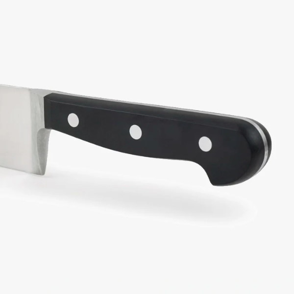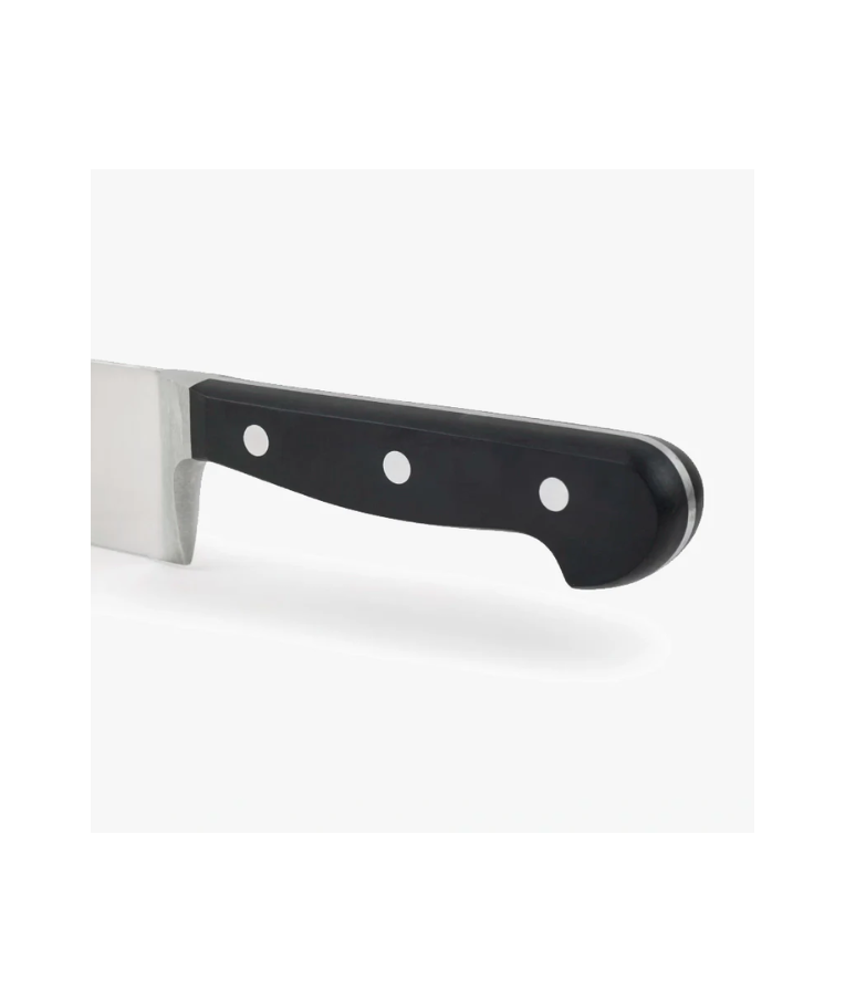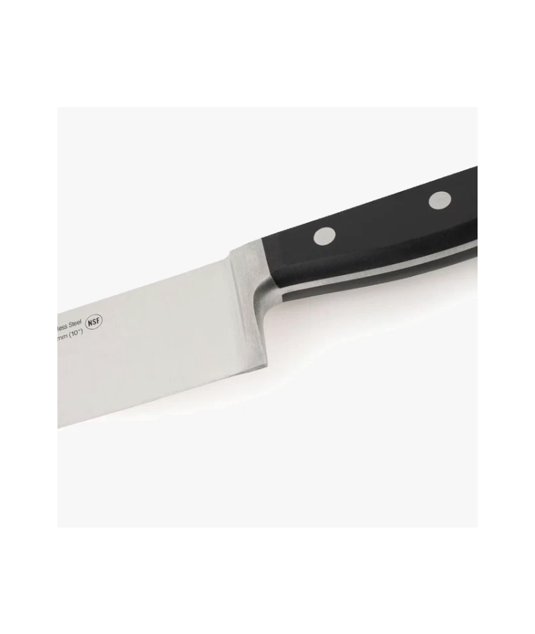 Peilis šefo CLASSIC PRO 260 mm – universalus virtuvinis peilis, skirtas daržovių, vaisių ir kitų maisto produktų pjaustymui bei smulkinimui. Plati, iš NITRUM® nerūdijančio plieno kaltinė geležtė pasižymi didesniu kietumu, atsparumu korozijai ir ilgaamžiškumu, todėl užtikrina tikslų bei švarų pjūvį tiek profesionalioje HoReCa virtuvėje, tiek namuose. Lygūs ašmenys leidžia patogiai atlikti kasdienius paruošimo darbus, o ergonomiška rankena su nerūdijančio plieno kniedėmis suteikia tvirtą ir saugų laikymą. Peilis tinkamas plauti indaplovėje, todėl yra praktiškas pasirinkimas intensyviam naudojimui.