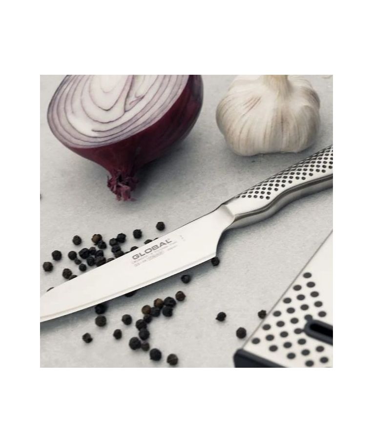 GLOBAL GS-58 – tai universalus šefo tipo peilis, būtinas kiekvienoje virtuvėje. 11 cm ilgio ašmenys užtikrina didesnį tikslumą ir leidžia patogiai atlikti daugumą kasdienių darbų: pjaustyti, smulkinti ir kapoti įvairius produktus. Dėl kompaktiško dydžio peilis yra lengvai valdomas ir itin manevringas.
