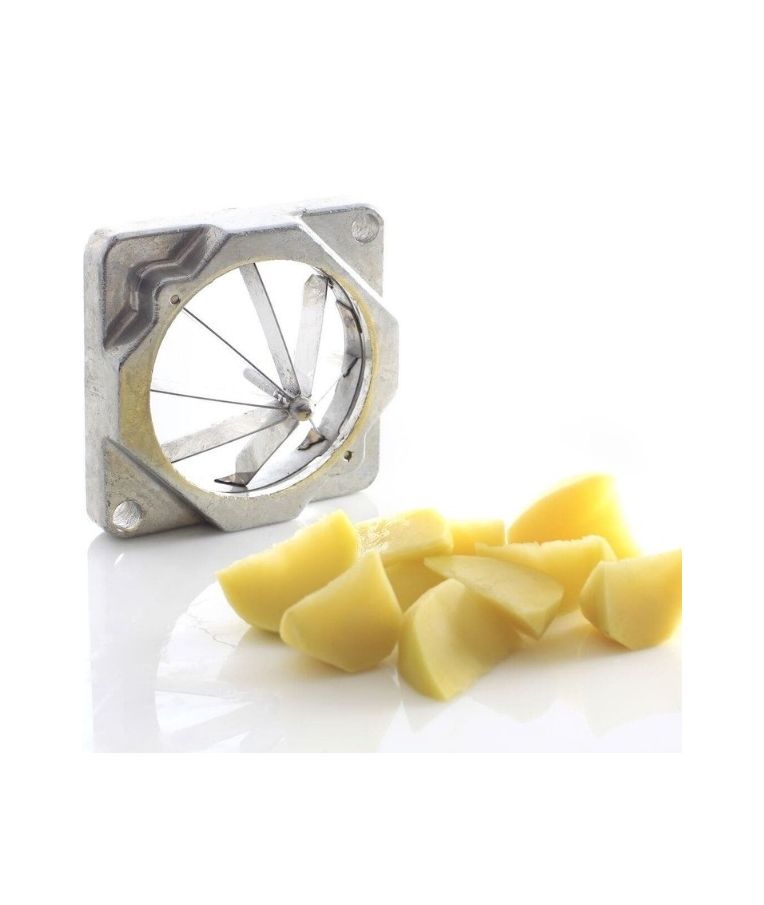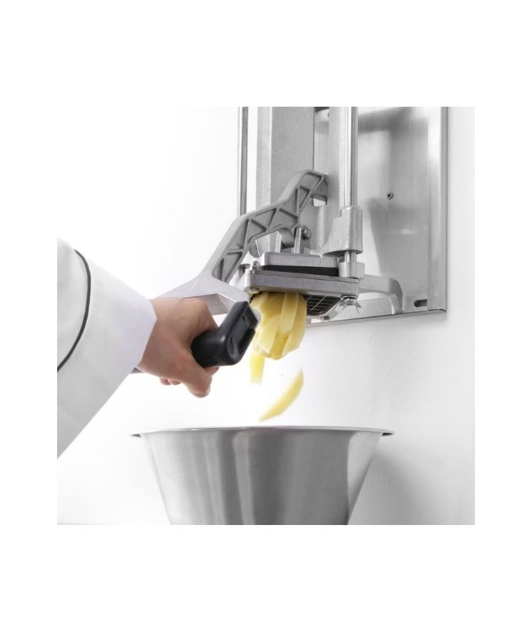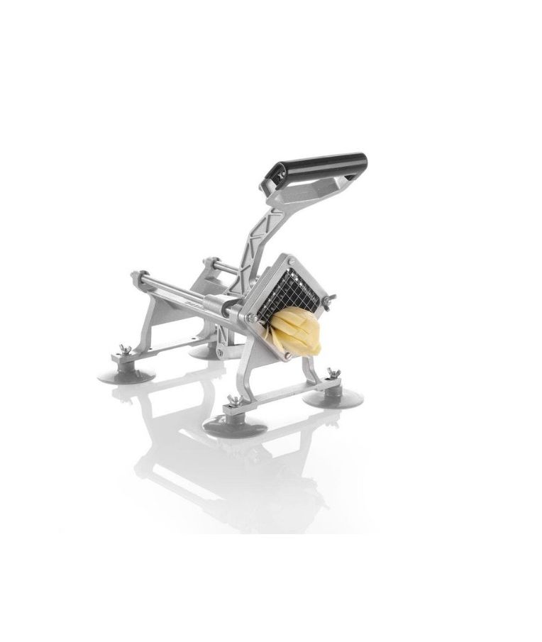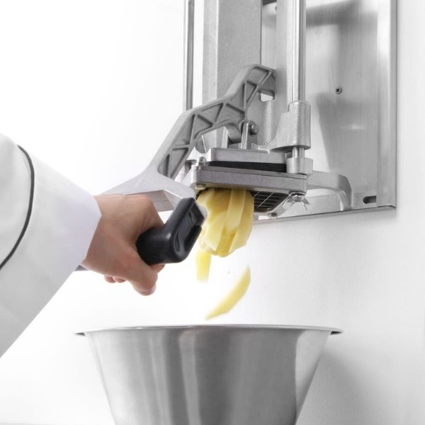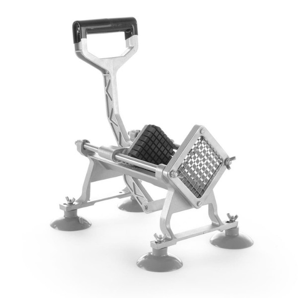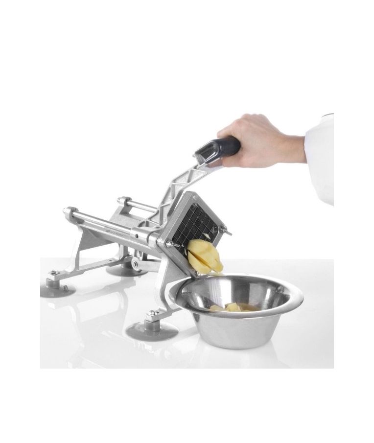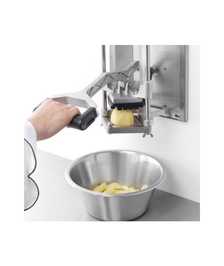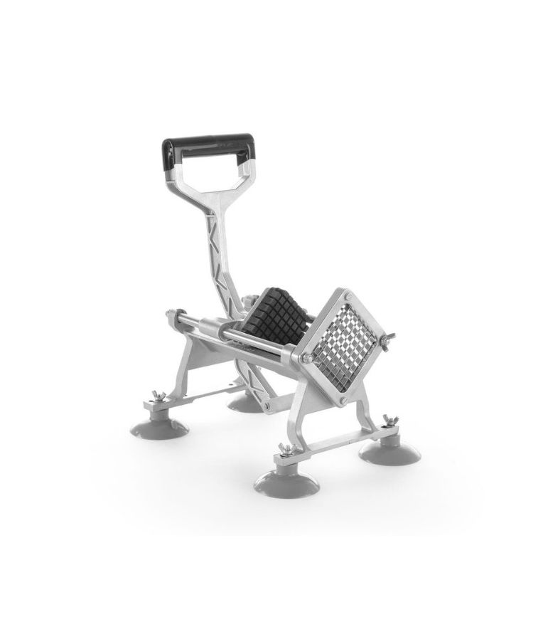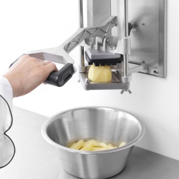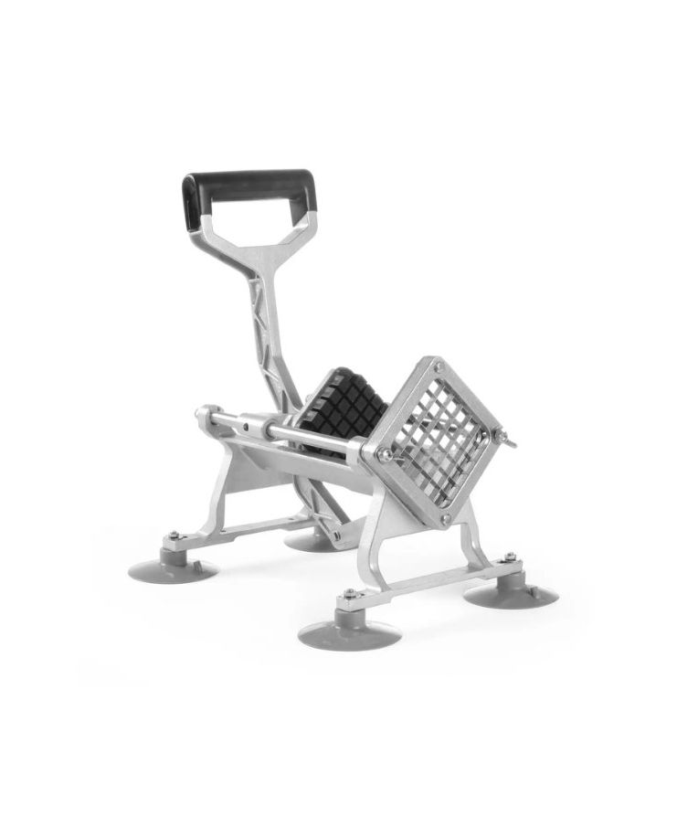 Pjaustyklė bulvėms HENDI – profesionalus sprendimas restoranams, kavinėms ir greitojo maisto virtuvėms, kur reikalingas greitas ir tikslus daržovių pjaustymas. Komplekte esantys nerūdijančio plieno peiliai leidžia pjaustyti bulves 6x6 mm, 9x9 mm ir 13x13 mm dydžio griežinėliais bei dalyti jas į 8 dalis. Stabilios kojelės su siurbtukais, ergonomiška plastiku dengta rankenėlė ir paprastas išardymas užtikrina patogų, saugų ir higienišką darbą intensyviomis sąlygomis.