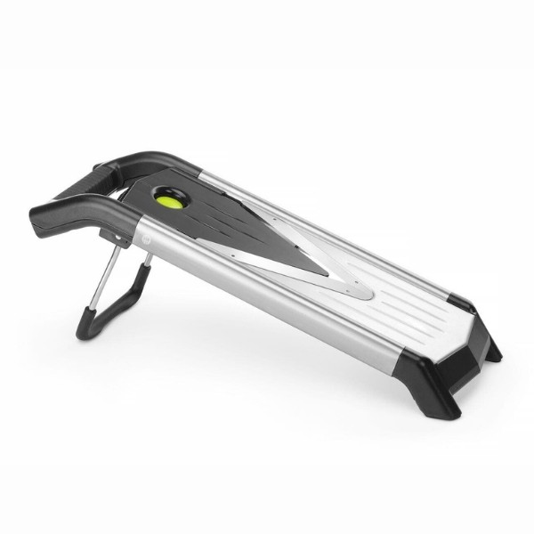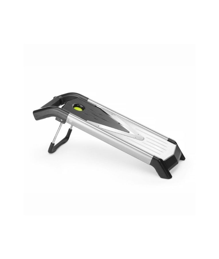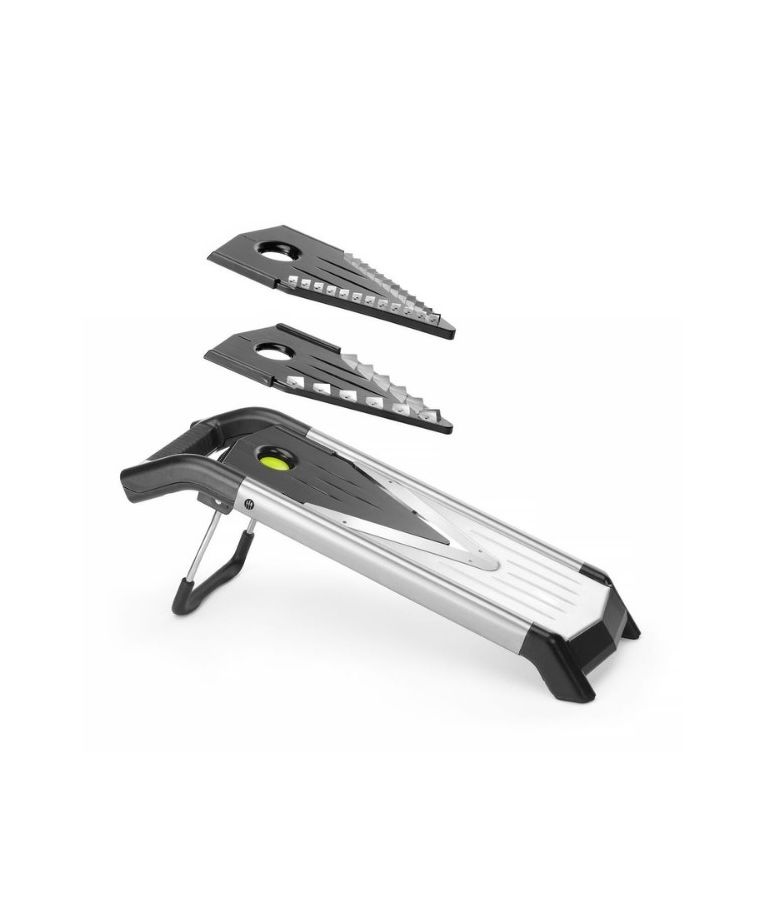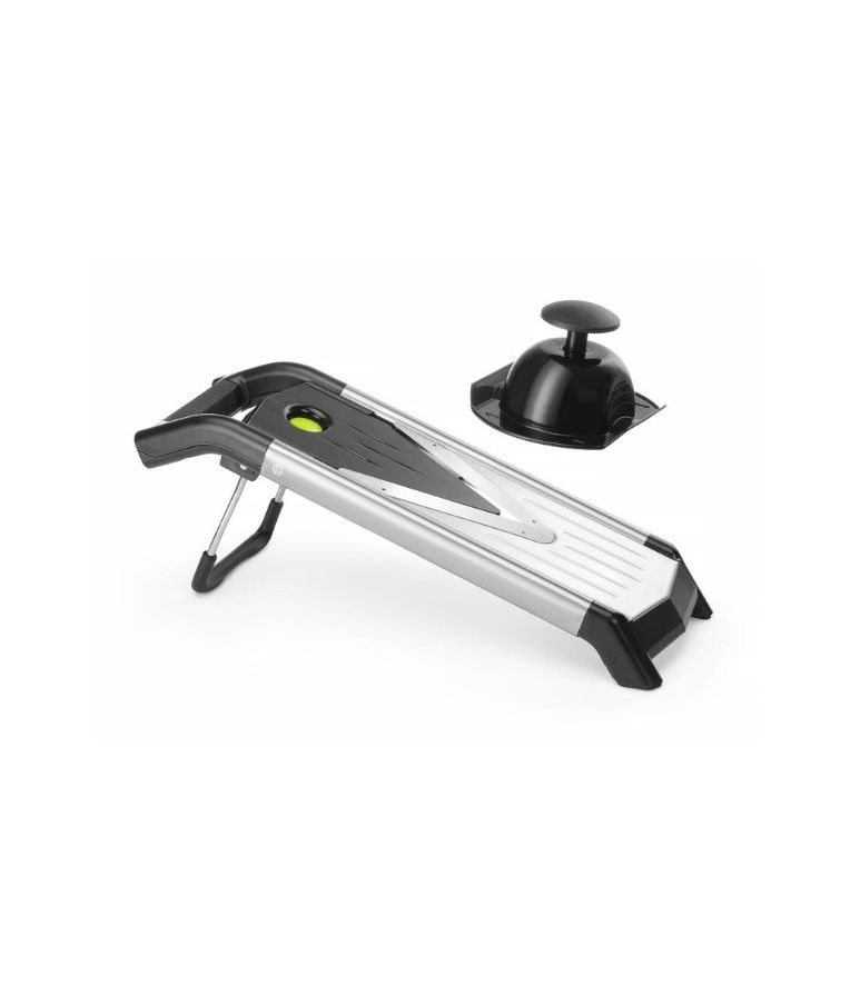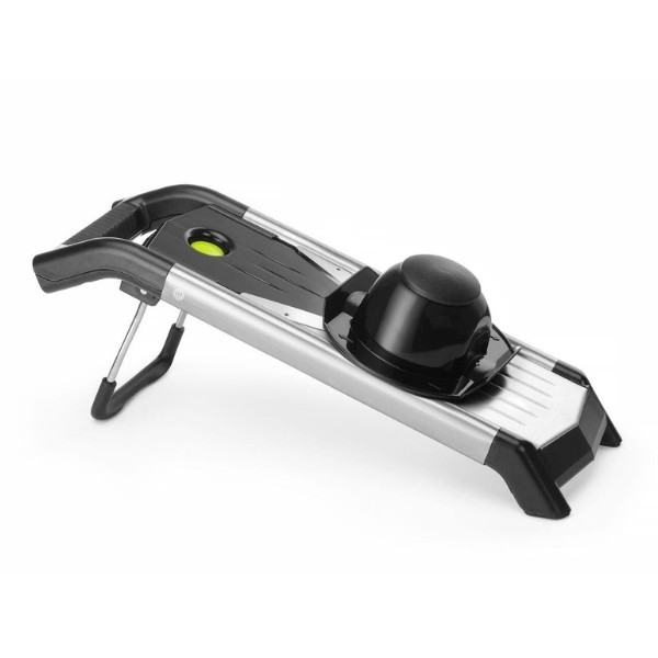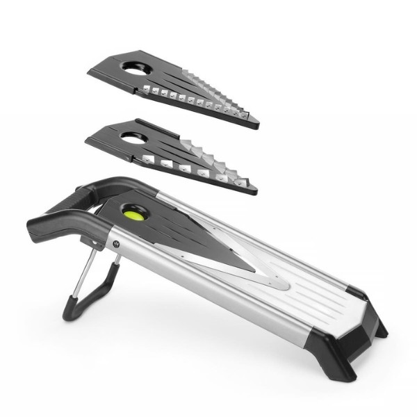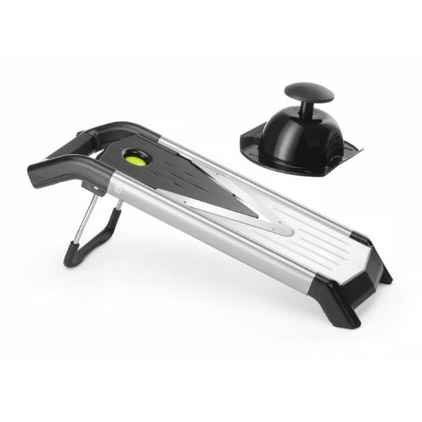 Daržovių pjaustyklė MANDOLINA HENDI – universalus ir daugiafunkcis įrankis restoranams, kavinėms ir maisto gamybos įmonėms. Aštrūs „V“ formos nerūdijančio plieno ašmenys užtikrina greitą ir tikslų pjovimą, o penki keičiamų antdėklų variantai leidžia reguliuoti pjovimo storį ir griežinėlių plotį. Greitas antdėklų keitimas vienu mygtuku, integruotas neslystantis stovas ir komplekte esanti pirštų apsauga padidina darbo saugumą ir komfortą. Pjaustyklė gali būti naudojama laikant rankoje arba ant stalviršio, o visas komplektas lengvai išardomas ir prižiūrimas.