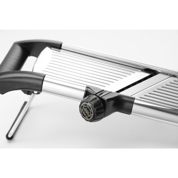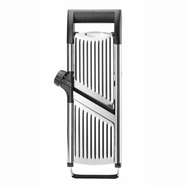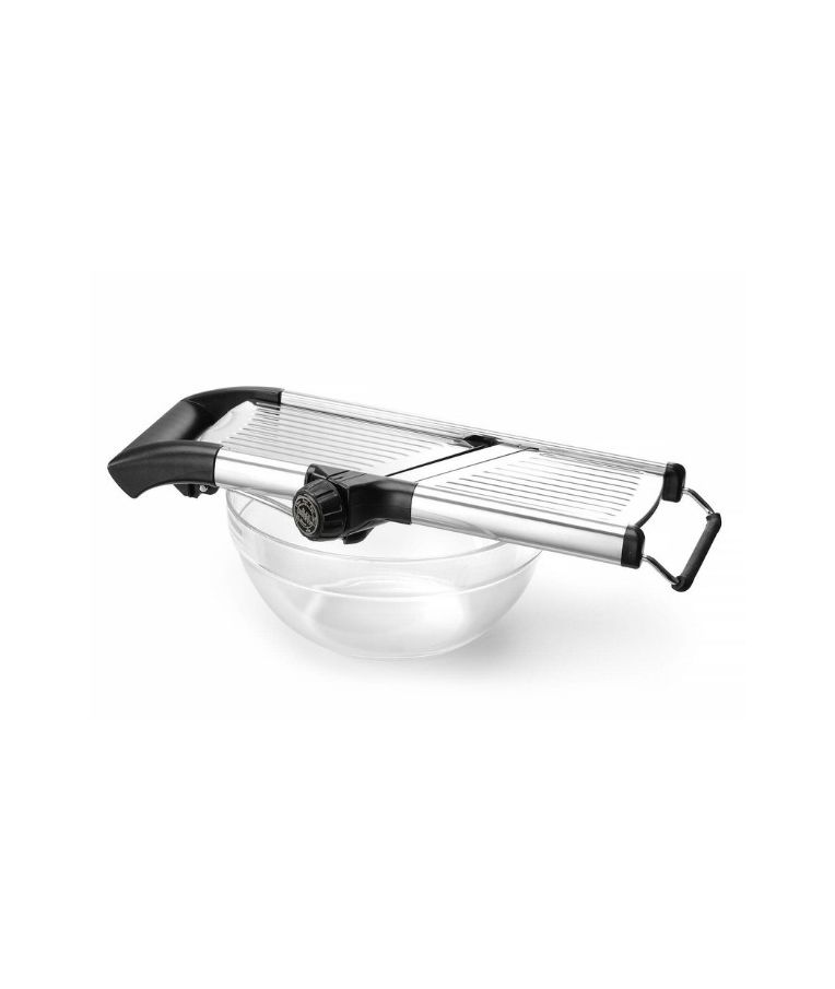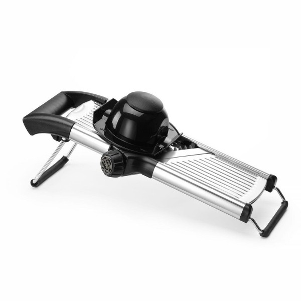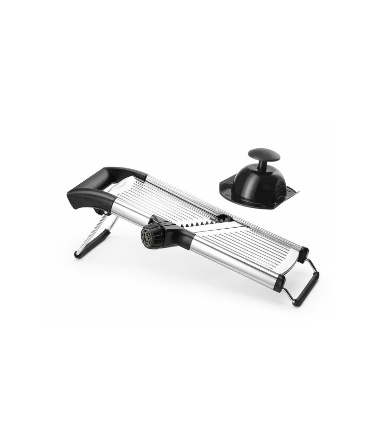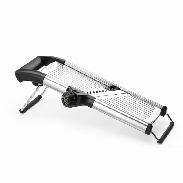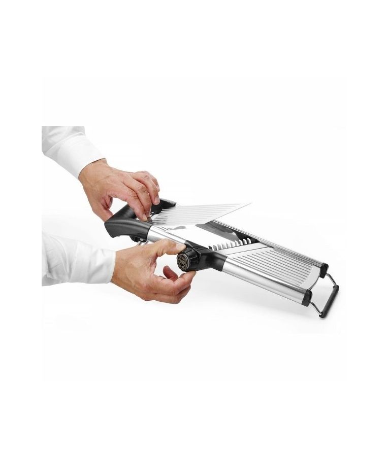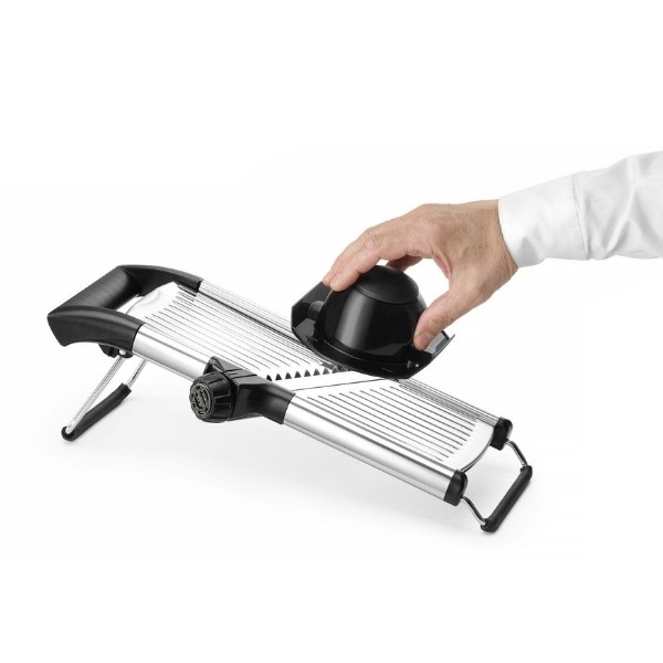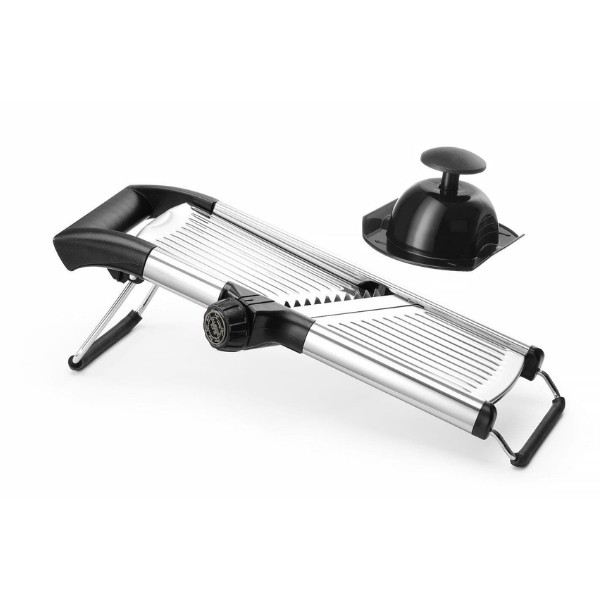 Daržovių pjaustyklė MANDOLINE HENDI – universalus įrankis restoranams, kavinėms ir maisto gamybos įmonėms. Itin aštri nerūdijančio plieno geležtė leidžia reguliuoti pjovimo storį nuo 1 iki 9 mm, o sukamoji rankenėlė suteikia galimybę pasirinkti 4,5 mm arba 9 mm griežinėlių dydį. Išimamas peiliukas palengvina valymą, o atrakinimo padėtis aiškiai pažymėta ant valdiklio. ABS rankena ir laikiklis bei neslystančios kojelės užtikrina stabilų ir saugų darbą. Pjaustyklė gali būti plaunama indaplovėje.