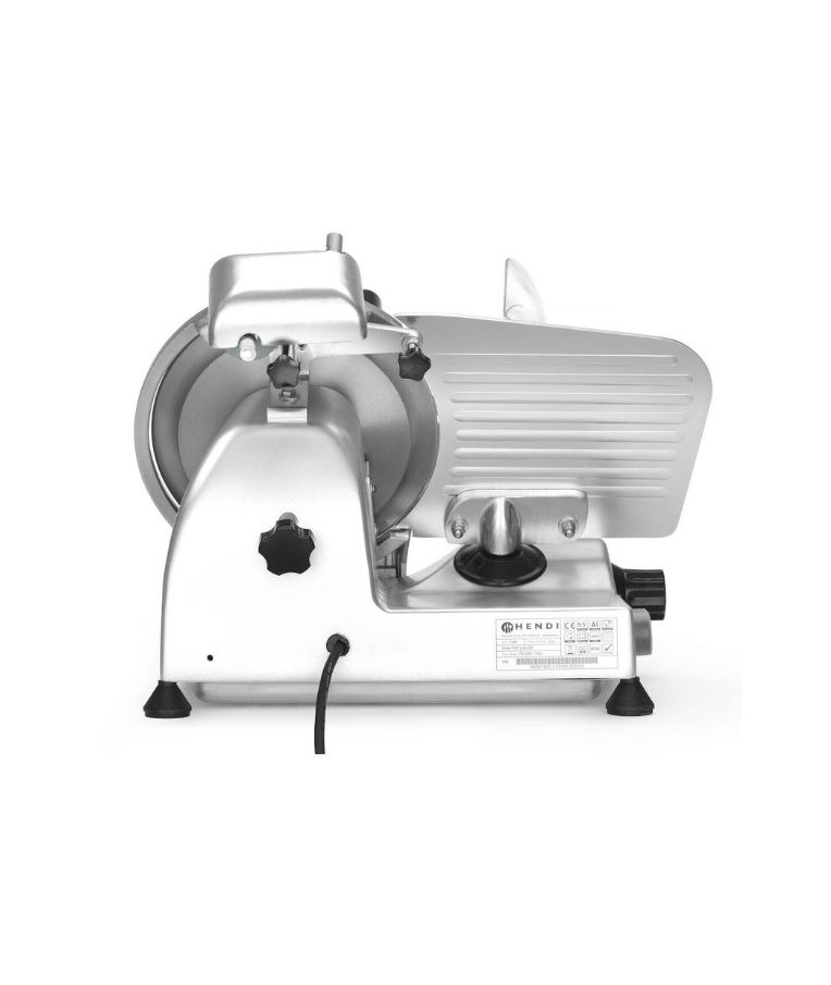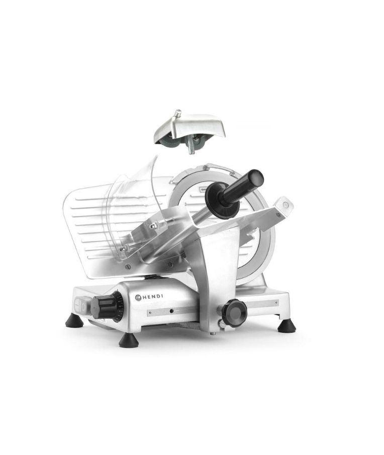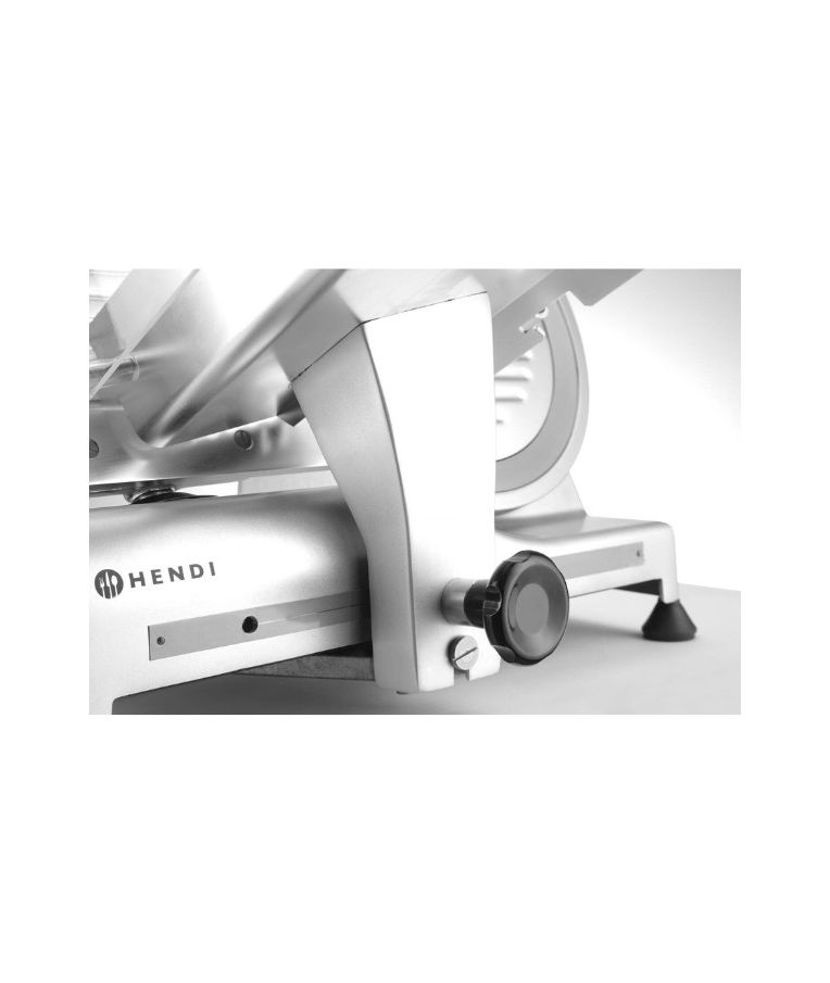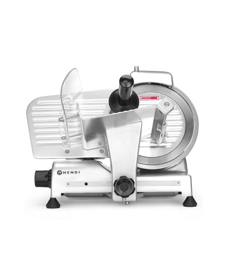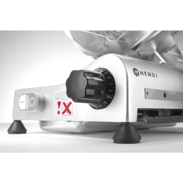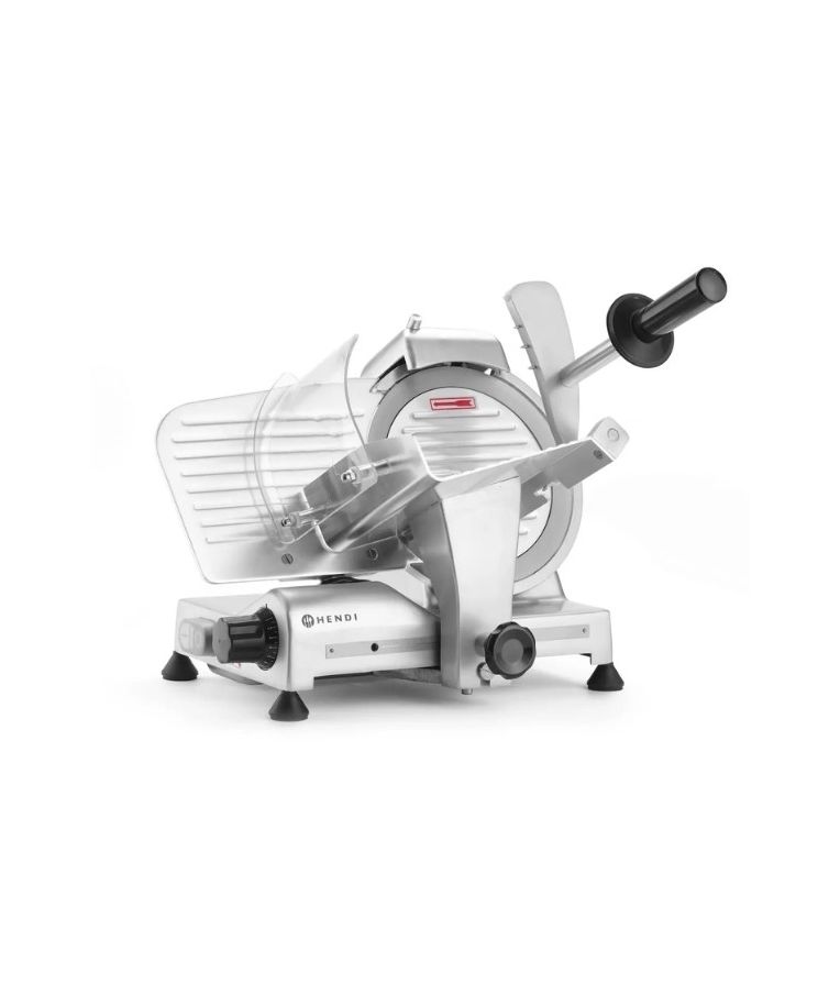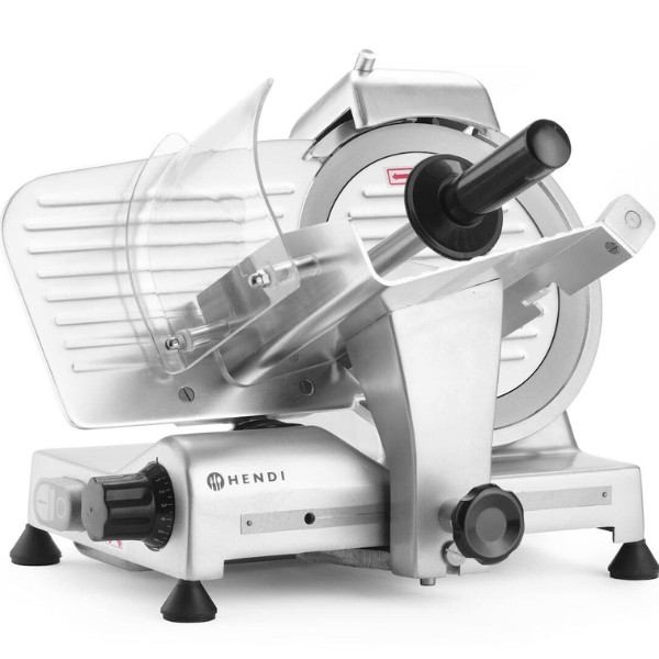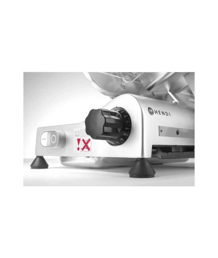 Profesionali pjaustyklė PROFI LINE 195 HENDI – patikimas sprendimas restoranams, kavinėms, mėsos krautuvėms ir maitinimo įstaigoms. Dengto aliuminio korpusas ir grūdinto nerūdijančio plieno ašmenys, išdėstyti įstrižai, užtikrina tolygų ir švarų pjūvį. Oru aušinamas variklis su apsauga nuo perkaitimo garantuoja stabilų darbą, o griežinėlio storio reguliavimas nuo 0 iki 12 mm leidžia lengvai prisitaikyti prie skirtingų produktų. Integruotas galąstuvas ir vežimėlis su apsauga padidina darbo saugumą ir patogumą.