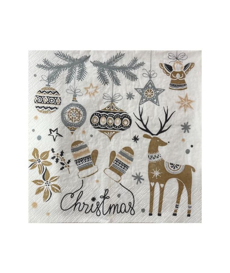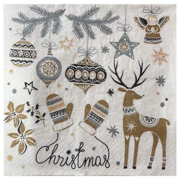 Trisluoksnės Kalėdinės servetėlės 33x33 cm (20 vnt.) su šventišku elnio, pirštinių, žaisliukų ir žvaigždučių raštu – puikus pasirinkimas Jūsų Kalėdų stalo dekorui. Švelnių aukso, pilkų ir juodų atspalvių dizainas suteikia elegancijos ir jaukumo, o aukštos kokybės popierius užtikrina tvirtumą bei patogų naudojimą. Idealiai tinka šventinei vakarienei, šeimos susibūrimams ar Kalėdų vakarėliams papuošti.