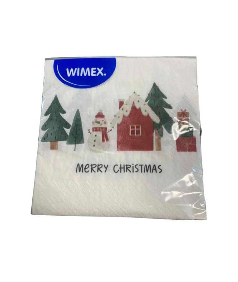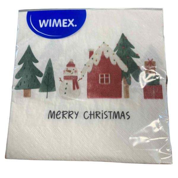 Trisluoksnės Wimex Kalėdinės servetėlės 33x33 cm (20 vnt.) – jaukus šventinis pasirinkimas su smagia žiemine iliustracija. Ant baltos servetėlės pavaizduotas sniego senis, kalėdiniai medžiai, namelis ir dovanos, o po piešiniu užrašas „Merry Christmas“ suteikia šventinio džiaugsmo. Aukštos kokybės popierius užtikrina patvarumą ir malonų pojūtį. Puikiai tinka Kalėdų vakarienei, vaikų šventėms ar šeimos stalo dekorui.
