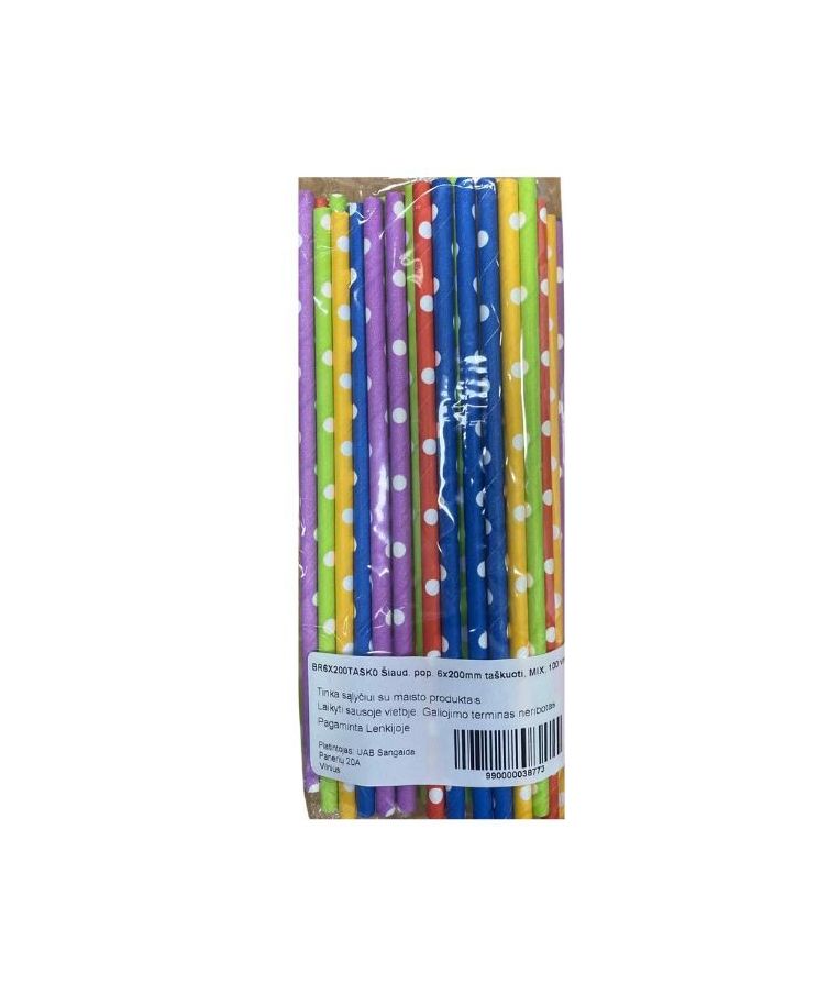 Popieriniai taškuoti šiaudeliai MIX 6x200 mm (100 vnt.) – spalvingas ir ekologiškas pasirinkimas gėrimams patiekti. Šie tvirti šiaudeliai puikiai tinka sultims, kokteiliams ar šventiniams gėrimams tiek kavinėse, baruose, tiek namuose. Ryškūs taškuoti raštai suteikia nuotaikingą akcentą stalui ir tinka įvairioms progoms.