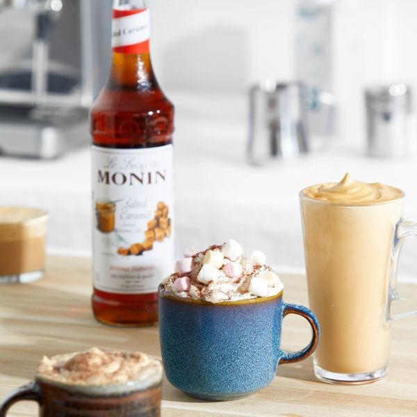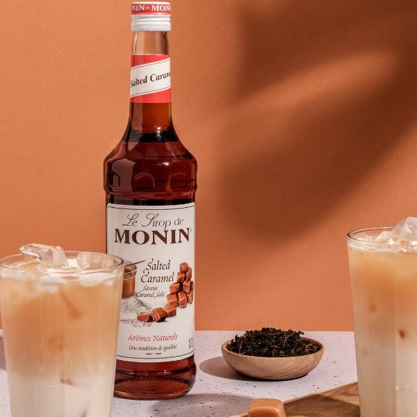 Pakaitinkite pieną ir įpilkite MONIN sūrios karamelės sirupo. Ant viršaus švelniai užpilkite espreso. Papuoškite norimu piešimu naudojant MONIN l'Artiste padažus.