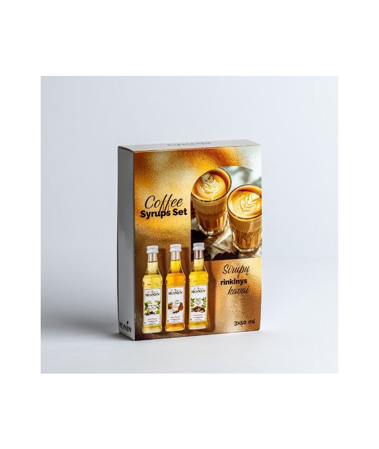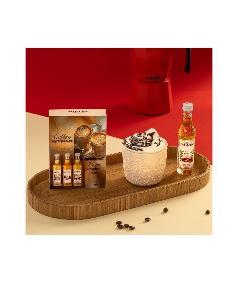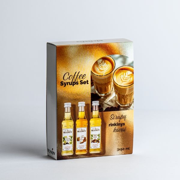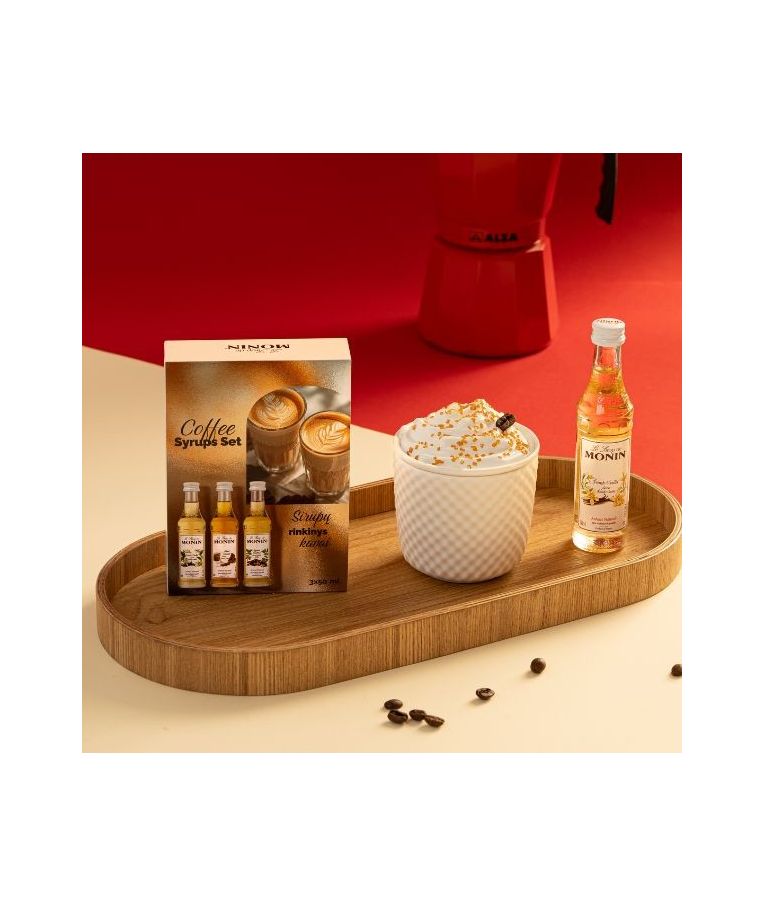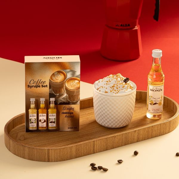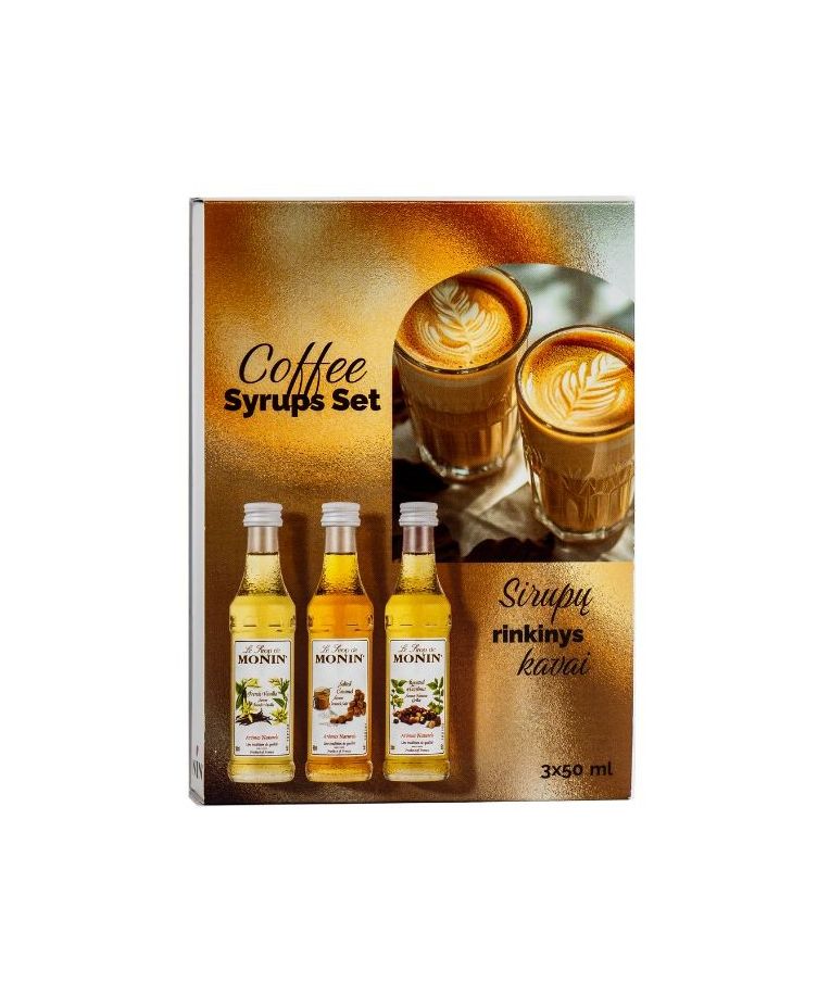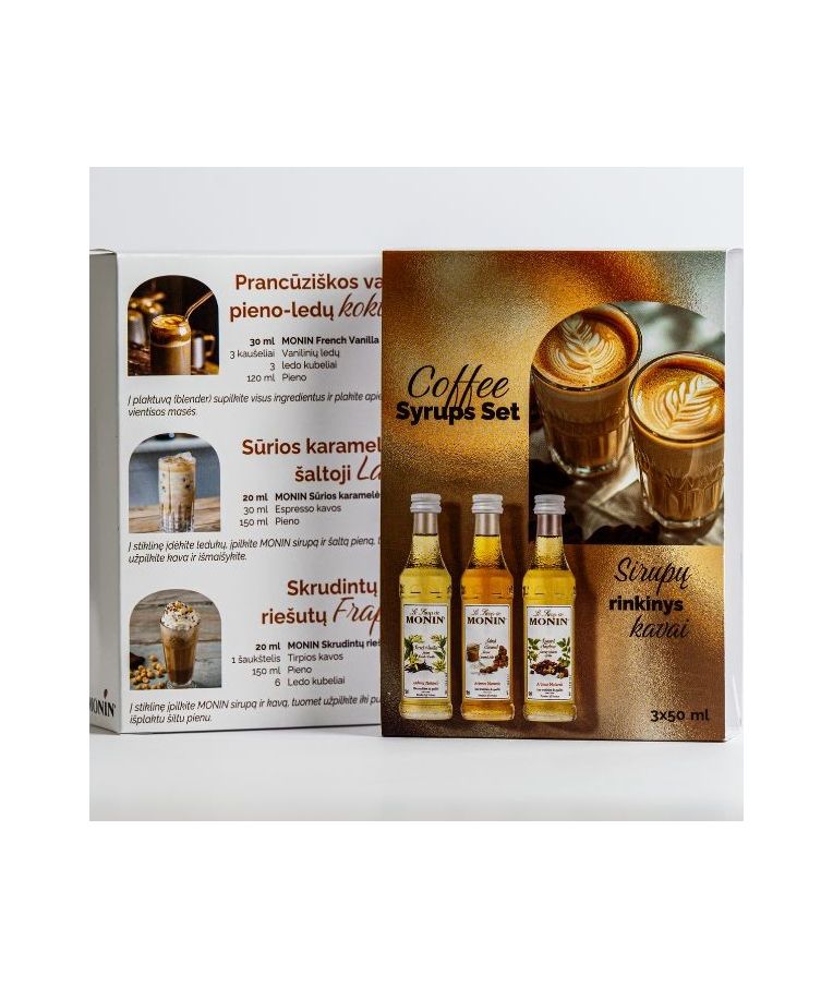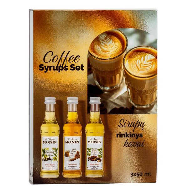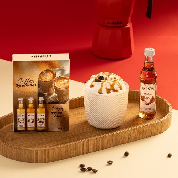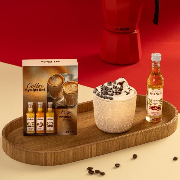 Sirupų rinkinys kavai MONIN 3x50 ml – tai trijų klasikinių skonių derinys: sūdyta karamelė, vanilė ir lazdynų riešutai. Šie sirupai suteikia galimybę paįvairinti kavos ar kitų karštų ir šaltų gėrimų skonį, suteikiant jiems subtilumo ir išraiškingumo. Sūdyta karamelė sujungia saldumo ir druskos harmoniją, vanilė išsiskiria sodriu ir švelniu aromatu, o lazdynų riešutai suteikia intensyvų ir malonų skonį. Puikus pasirinkimas namams ar HoReCa sektoriui – kavinėms, barams ir restoranams.