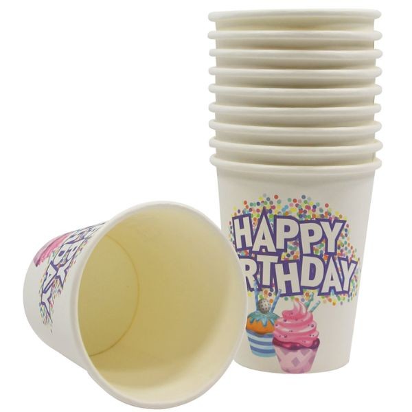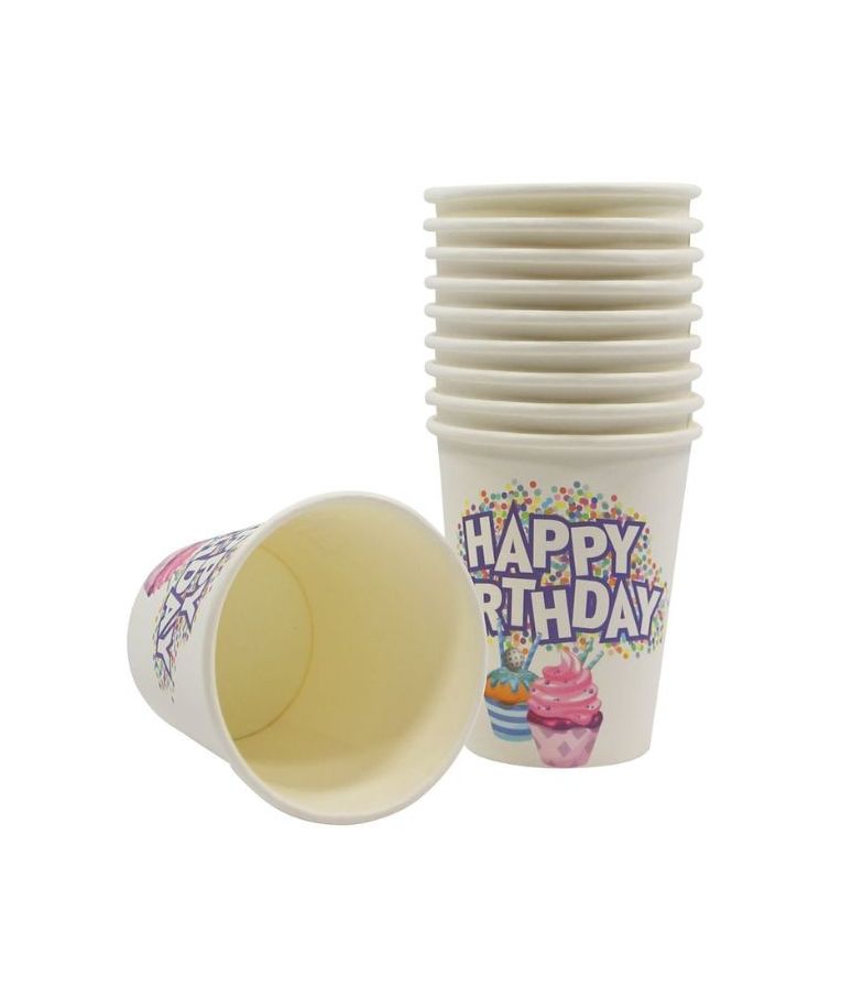 Vienkartinės popierinės stiklinės HAPPY BIRTHDAY 200 ml (10 vnt.) – puikus pasirinkimas gimtadieniams, šventėms ir įvairiems renginiams. Ryškus ir žaismingas dizainas su gimtadienio tematika suteikia stalui šventiškumo, o 200 ml talpa tinka tiek gaiviesiems gėrimams, tiek sultims ar kitoms šalto gėrimo porcijoms. Popierinės stiklinės patogios naudoti, lengvos ir praktiškos tiek vaikų, tiek suaugusiųjų šventėms.
