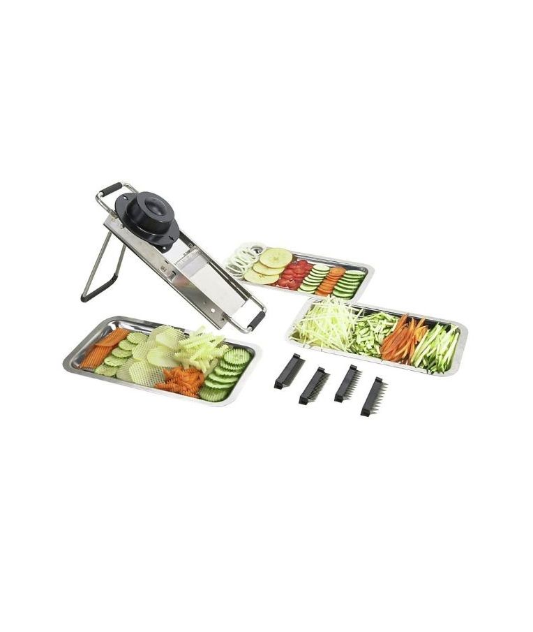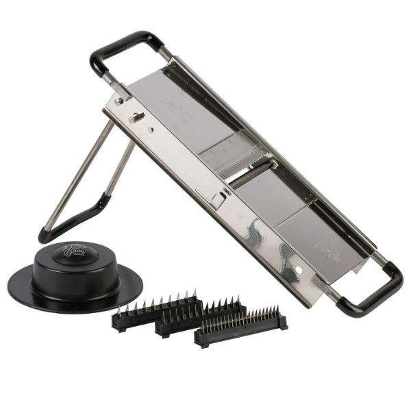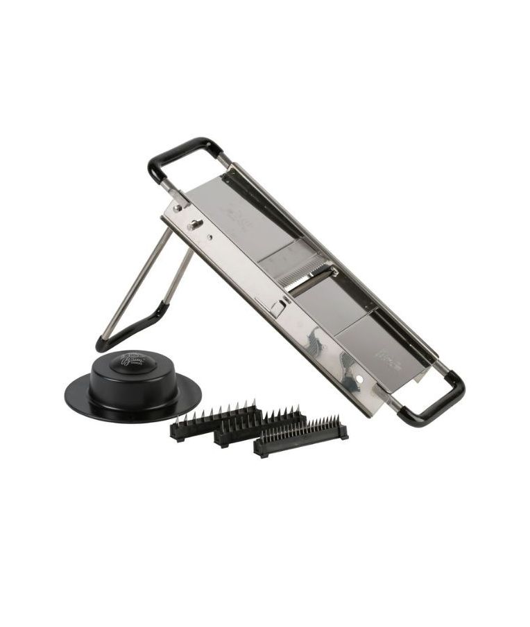 Profesionalus daržovių pjaustytuvas LOUIS TELLIER The Chef's Mandoline – tai aukštos kokybės nerūdijančio plieno įrankis, sukurtas intensyviam naudojimui gastronomijoje ir namų virtuvėje. Tvirta konstrukcija ir neslystantis pagrindas užtikrina stabilumą bei saugumą pjaustymo metu. Dvigubai galąsti ašmenys leidžia lengvai ir tiksliai pjaustyti vaisius bei daržoves įvairiomis formomis. Komplekte esantys keturi skirtingų pločių peilių rinkiniai (2, 4, 7 ir 10 mm) suteikia galimybę pritaikyti pjaustymą pagal poreikius. Sulankstoma atrama palengvina laikymą ir užtikrina patogų darbą bet kokioje virtuvėje.