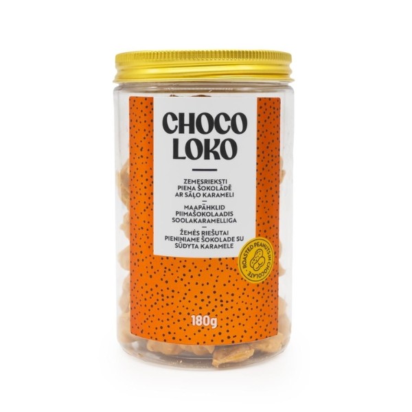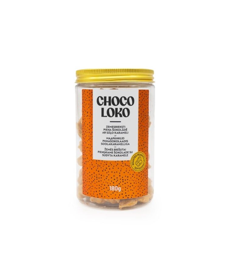 Sudedamosios dalys: skrudinti ŽEMĖS RIEŠUTAI 60 %, šokoladas su karamele 39 % (cukrus, kakavos sviestas, pieno milteliai, kakavos masė, emulsiklis: sojų lecitinas, aromatizatorius, prieskoniai, natūralus vanilės aromatas), jūros druska 0,25 %. Kakavos kiekis šokolade – ne mažiau kaip 26 %. Gali būti glitimo ir riešutų pėdsakų. Maži vaikai gali užspringti.